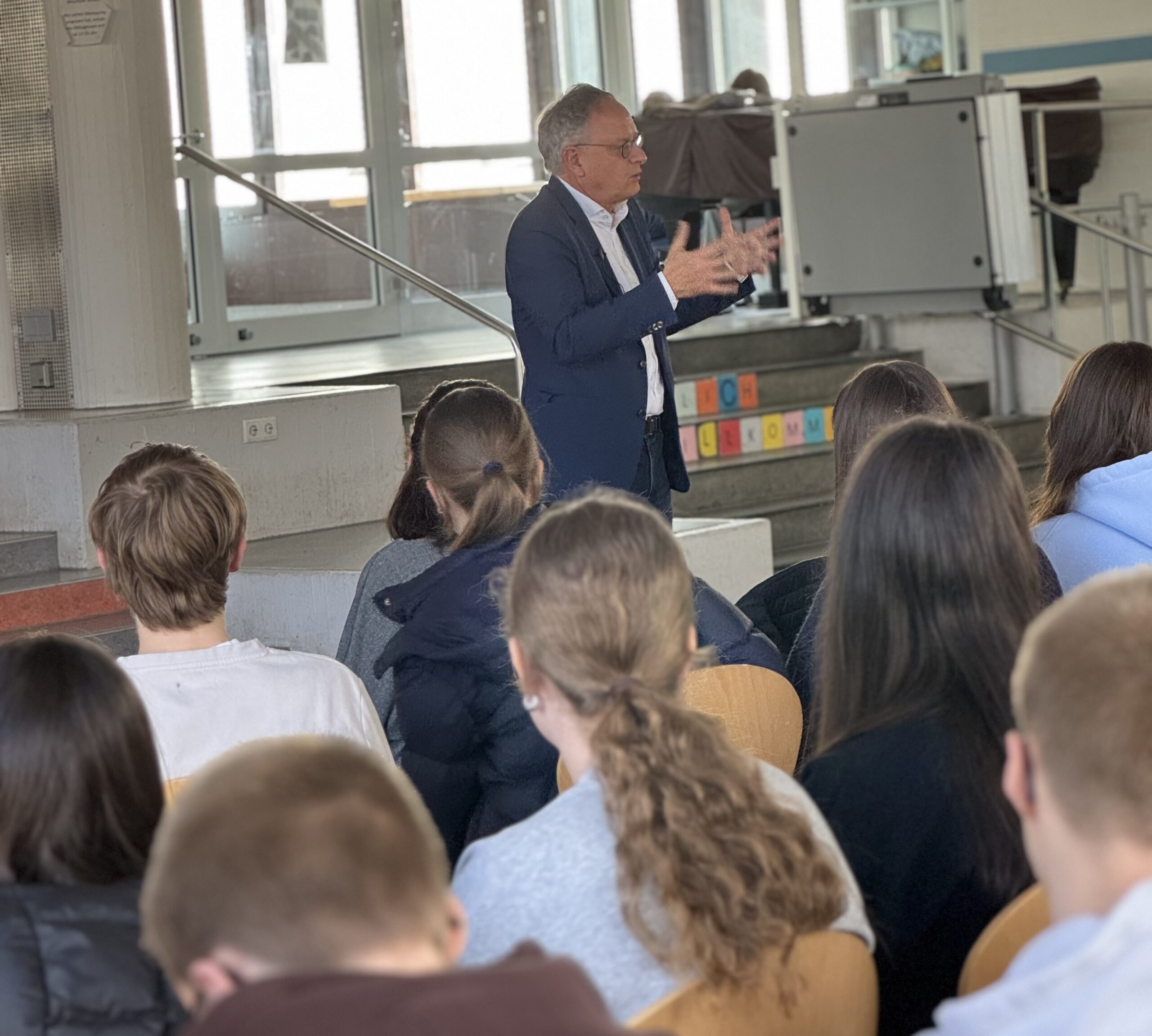 Mehr als 120 interessierte Schülerinnen und Schüler der Klassen 9 bis 11 versammelten sich dazu in der Mensa und konnten ihre Fragen an den Abgeordneten stellen. Stoch, der zugleich Vorsitzender der Landes-SPD ist und einige Jahre Kultusminister in Baden-Württemberg war, beleuchtete die Rolle und Aufgabe Deutschlands in der EU und beantwortete dabei Fragen zur EU-Debatte um das „Verbrenner-Aus“, gestiegene Energiepreise, ein Tempolimit und die mit der geopolitischen Lage verbundenen Zukunftsängste, die Einführung der Wehrpflicht und Verteidigungsfähigkeit der EU.